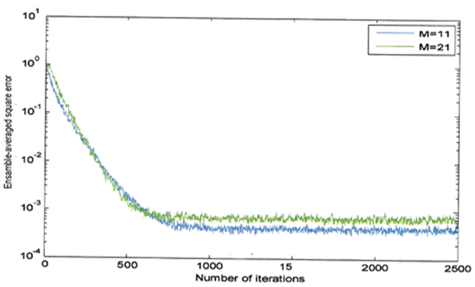 Figure 3 demonstrate the learning curves of two ATF sizes M=11, and M=21 for a channel with w=3.3 (corresponds to eigenvalue spread of 21.7132), SNR= 40dB, and µ=0.07. According to the second order analysis, the step-size parameter has to be less than (2/Mr(0)). The value of r(0) corresponds to w=3.3 is 1.2265 therefore µ shall be less than 0.148. We conclude that the value of µ =0.07 is appropriate to the ATF size M=11, and the averaged square error decreases with the increasing number of iterations and reaches steady state after iteration 300, but the case is different with adaptive transversal ATF order M=21, because the step size is so high so that the averaged square error is in ascending order. If we select proper step size µ, such as 0.035 and apply this for both ATF orders as shown in Figure 4, we come to know that the difference between both curves is insignificant. Therefore, based on this result we select the ATF order M=11. This selection is consistent with the fact that design of any system shall be cost effective, so it is not reasonable to select higher ATF order.