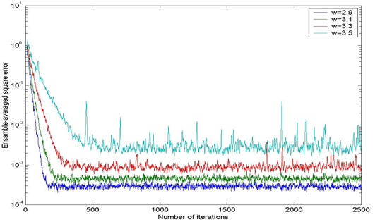 It is clear from the above Figure that as the eigenvalue spread ( χ ) increases, the convergence speed of adaptation process will decrease associated with the increasing of the ensemble-averaged square error. This indicates that the LMS strategy is very sensitive to χ. It is important that the eigenvalue spread ( χ ) is related directly to (w).