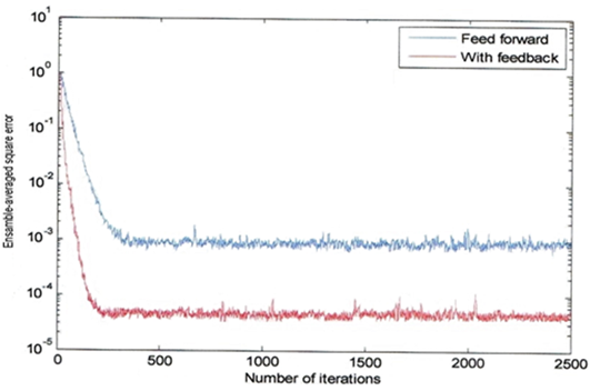 Figure 10 demonstrates the learning curves of the DFE for the channels corresponding to w=3.3, and 3.5. In both cases, we take the forward ATF order M1= 11, feedback ATF order M2 =3, and using the same step-size parameter µ = 0.07. Comparing both learning curves of the two channels, it is clear that this method shows less sensitivity to eigenvalues spread than the cases without feedback.