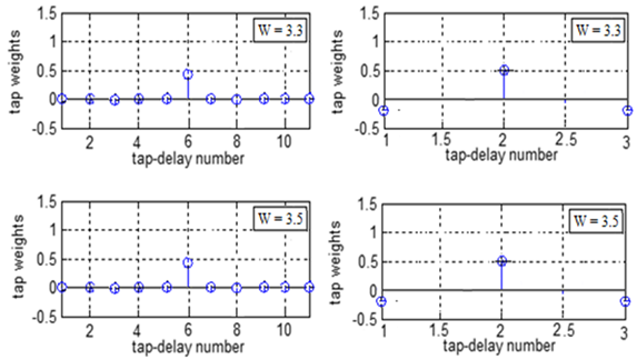 Figure 6 below depicts the optimum tap-weights values obtained after iteration (2500) for each of the four eigenvalues spread. It can be seen that the tap weights of the equalizer for all four eigenvalues are symmetric around 6 since the ATF order is 11. The value of center-tap increases with increasing of the eigenvalue spread and this leads to the conclusion that the change in eigenvalue will affect the impulse response of the ATF.