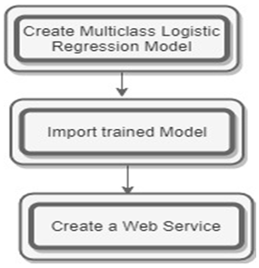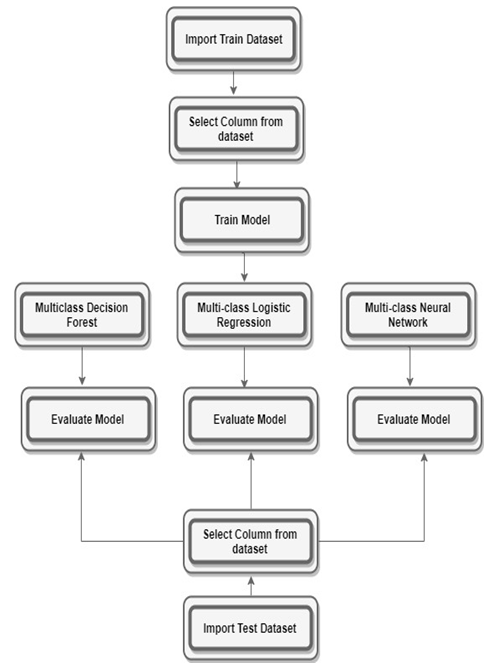 First of all, to create any machine learning model the most important part is data. Here in this case, we have used a benchmarking dataset [15] to train and evaluate model. This dataset has two parts; one for training and one for testing. Once the dataset was there, we were to import train dataset into Azure Machine Learning Studio and then columns were selected from dataset that were used for training and evaluation. Here in this dataset, all columns except the subject column that contains ID of subject in experiment were taken once columns had been selected various machine learning algorithm were selected to train model with training data. For this experiment, three algorithms were chosen from Azure Machine Learning Studio i.e. Multiclass Decision Forest, Multiclass Logistic Regression and Multiclass Neural Network after algorithms being selected. We will train them using train model module from Azure Machine Learning Studio. After the training is complete, it is time to evaluate model for that score model and evaluated modules are used from Azure machine learning studio. For evaluation, we had imported test dataset. Once evaluation is completed, now it can be seen that which algorithm performed the best among them in this case Multiclass Logistic Regression outperformed them all so up till now a machine learning models were created and evaluated and based on evaluation it is known that which algorithm did best. After this second part of implementation started.