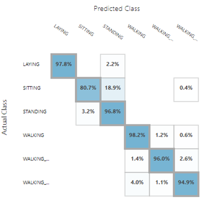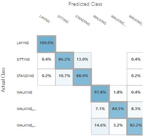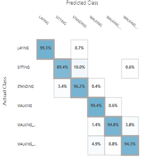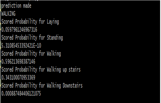 The main purpose of this paper is to perform automated activity recognition so that it can be helpful for patients’ and elderly persons’ activity monitoring thus creating a web service for that purpose using the machine learning model. Here, six evaluation parameters are used for all three models, namely Overall Accuracy, Average Accuracy, Micro-Averaged precision, Macro-Averaged precision, Micro-Averaged recall and Macro-Averaged precision. Value for each evaluation parameter is shown in Table 1 as it can be noted that Logistic regression has highest overall accuracy and average accuracy of 96.75 and 98.55 respectively it can also be observed that multiclass decision jungle has least overall and average accuracy of 90.26 and 96.75. In order to get even closer look at results, confusion matrix is plotted as we have six labels, so we had the confusion matrix of order 6 by 6. Figure 3 shows confusion matrix for Logistic Regression. It can be seen that 99.3% times laying was recognized correctly and rest of 0.7% times it was recognized as standing. It was due to the reason that in both situations subjects were actually still. Sitting was recognized correctly 89.4% times, rest of the time it was recognized as standing or walking. Standing was recognized correctly for 96.2% times and 3.4% times it was recognized as laying and rest it was recognized as walking. Walking was recognized 99.4% times and all the other times it was considered as walking upstairs, walking upstairs was recognized correctly 94.8% times, all the other times it was recognized as either walking straight or walking down stairs. Walking down stairs was recognized perfectly 94.3% of the times. For all other instance, it recognized it as either walking or walking downstairs. From this confusion matrix, it can also be seen that standing was the activity that was recognized with most accuracy i.e. 99.4%, the activity that was recognized with least accuracy was sitting i.e. 89.4%. Figure 4 shows confusion matrix for multiclass decision forest. It can be seen that the activity that was recognized with most accuracy is laying and activity recognized with least accuracy is walking down stairs. Figure 5 shows the confusion matrix for multiclass neural network. It shows that activity recognized with the highest and the least accuracy were walking and sitting respectively. Figure 5 shows the results from web service when Web Service is called with python code it returns scored labeled i.e. predicted output. it also returned probability for all the labels as here in Figure 6 it can be seen that it had predicted walking it has also given probability for other classes as well.