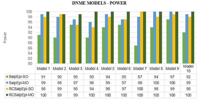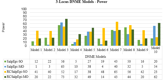Figure 7 exposes the power of four approaches of the 2-Locus DNME models. With the exception of model 3 and model 4, RCSalpEpi-MO obtained 100% power for all ten DNME variants. The RCSalpEpi-SO only attained 100% power for model 7. In the case of model 8 and model 9, the SalpEpi-MO [19] provided 100 percent power. For model 9, the SalpEpi-SO [19] has the maximum detection capability of 97 percent. The result designates that the proposed approach RCSalpEpi-MO is superior to others.