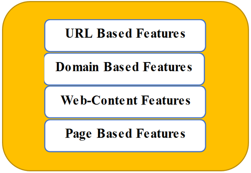 To detect phishing websites, a variety of features are available. This study found four different categories of website features in a recent review of several studies: URL-based, domain-based, web-content/source-code-based and page-based features, as shown in Figure 5.