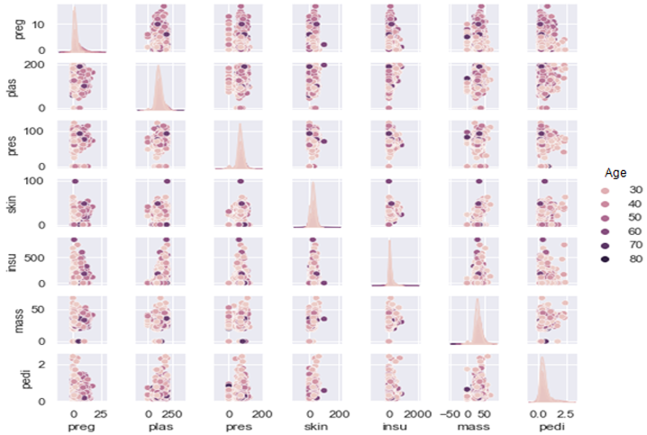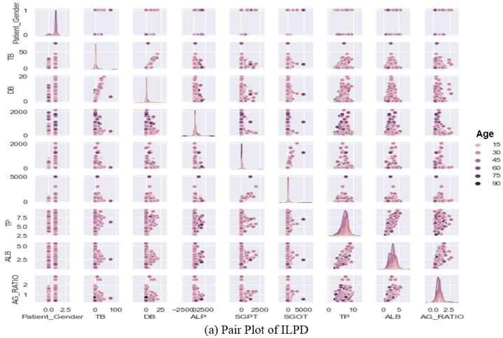 The disease datasets that were used in this research study were acquired from Kaggle data science community. The datasets consist of the Indian Liver Patient Dataset (ILPD) [36] and the PIMA Indians diabetes dataset [37]. The ILPD dataset has 583 records and 10 attributes besides a selector-field that classifies liver patients. It consists of 416 liver disease patients and 167 non-liver disease patients. The PIMA dataset has 768 records and 8 attributes besides a selector-field that classifies diabetic patients. It consists of 500 diabetic patients and 268 non-diabetic patients. Figure 2 shows the features of ILPD and PIMA respectively. Figure 3 gives the pair plot of the disease datasets taken. The figures illustrate the matrix of relationships between each attribute in the dataset. It visualizes the relationships between each attribute present in the ILPD and PIMA datasets respectively, which helped with the immediate analysis of the data.