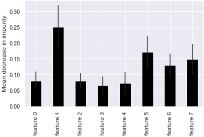 The features of the acquired datasets were toned down by using forest of trees to assess the importance of features. We used GINI Importance, also known as Mean Decrease in Impurity (MDI), to measure feature importance with Random Forest model. The mean and standard deviation of accumulation of the impurity decrease within each tree was calculated using the fitted attributes of the disease datasets. Seven features and five features were selected from ILPD and PIMA respectively Figure 4 and Figure 5.