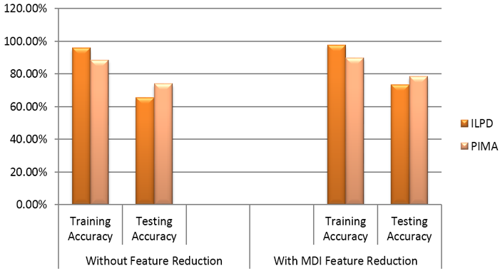 The objective of this study was to find out if a patient will acquire a particular disease or not. Firstly, from our proposed method we trained and tested the datasets with individual learners. We then trained and tested the datasets with their voting ensemble. Later, we prioritized the data by using the MDI based feature selection technique and removed the attributes that were less important in each dataset. After the implementation of the proposed ensemble model, Table 3 and Table 4 present the classification report and confusion matrix of ILPD and PIMA respectively.