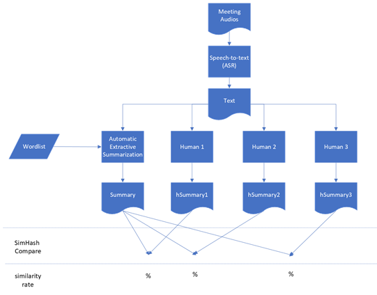 Figure 1 clearly shows the work steps through the proposed solution. All meeting audios files were first applied to speech to text operation. Later, the texts obtained were summarized as 40% and 20% of the whole text. Each meeting text was also summarized in the same proportions by 3 different human summarizers. Finally, human and machine extractive summaries were compared with selection of similar sentences in the original text files. The ratio of similar sentences over total sentences in the extractive summary gives the success of the summarization in terms of one human summarizer. The average of ratios with all summarizers determines the success of our extractive summarizer.