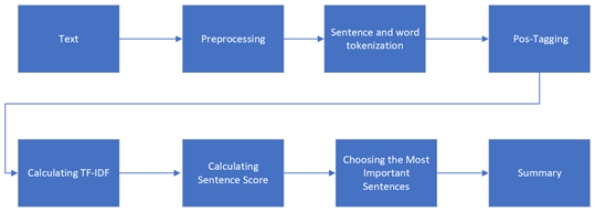 The text summarization process steps applied are showed in Figure 2. The details of summarization using TF-IDF algorithm are explained below stepwise (a) through (f).