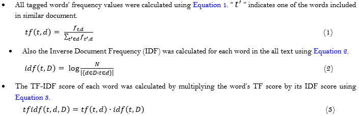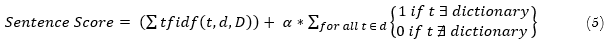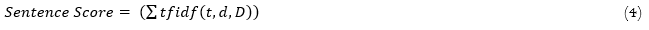 The score of each sentence was calculated using Equation 4, where the TF-IDF values of the words belonging to this sentence is the summed up.