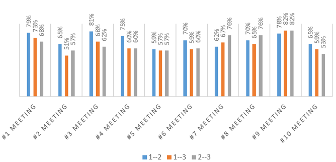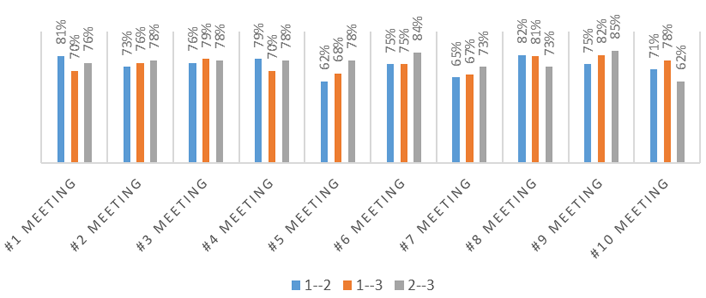 As a result, similarity rates of human summaries ranged between 60% and 86%, 75% on average for 40% summaries. Additionally, similarity rates of human summaries ranged between 50% and 83%, 67% on average for 20% summaries. The blue line represents the similarity ratio of the 1st and 2nd human summaries; the orange line represents the similarity ratio of the 1st and 3rd human summaries; the gray line represents the similarity ratio of the 2nd and 3rd human summaries.