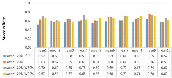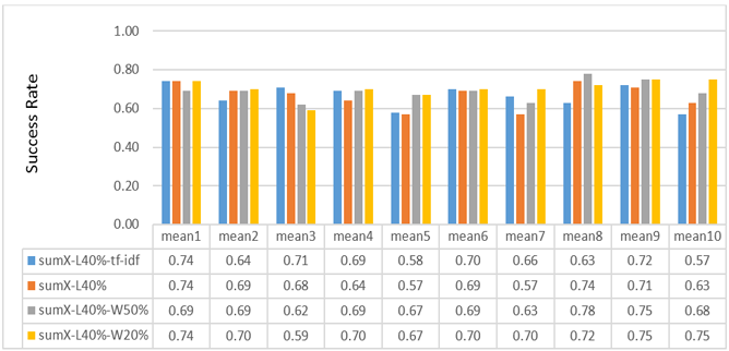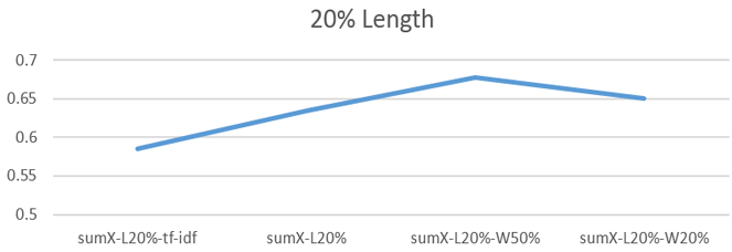 Figure 5 shows the similarity between human and extractive summaries for the 40% length of summaries. The blue line point represents only using TF-IDF algorithm, the orange line represents using a dictionary form that doesn’t use a “word ratio”, the gray line represents adding a dictionary with 50% “word ratio” and the yellow line represents using a dictionary form with 20% “word ratio”.