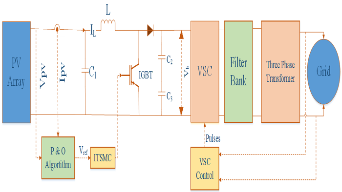 Grid-connected PV systems are of tremendous interest for producing power in large-scale applications because of their economically optimal size, design, and cost [1, 2].The photovoltaic energy sector saw tremendous progress in the last decade. As a result of this progress, complex PV grid topologies have begun to evolve to boost power, efficiency, and reliability. Furthermore, grid-connected PV systems (which do not require batteries) are well-known for being less expensive than stand-alone PV systems (which do require batteries)[3]. Despite significant advancements in the field of PV systems, there are still issues with PV grids such as voltage regulation, power quality, and grid problems. A PV grid requires a robust control mechanism to mitigate all of these drawbacks [4, 5].