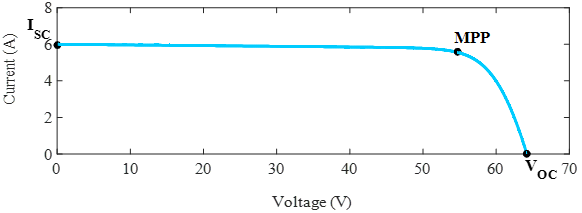 Figure 3 depicts the I-V characteristics of a PV cell [11] highlighting the importance of short circuit current (highest current at zero load) and open circuit voltage (voltage at zero current). The maximum power point can be obtained by using the highest voltage V, MPP and current, as shown in the figure.