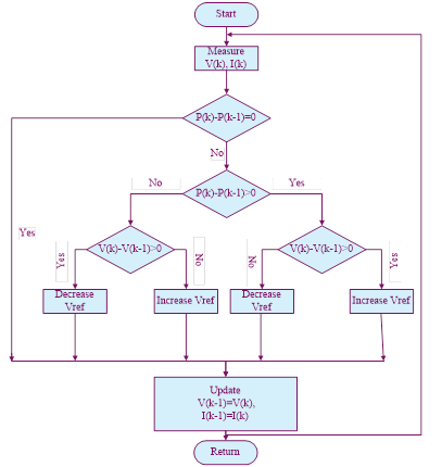 Figure 4 depicts the perturb and observe algorithm, which demonstrates how the reference voltage V ref changes in response to the PV array's power output. When there is a power decrease, perturbation is usually in the same direction as the power increase, and when there is a power decrease, perturbation is in the other direction [17]. The process of observation and perturbation continues until the maximum power point is reached, and a reference voltage is found, which should be compared to the voltage generated V_PV. The difference between these two voltages must be regulated so that it does not change the duty cycle of the maximal power, which affects the boost converter's output voltage. As a result, the duty cycle of pulse width modulation PWM delivered to IGBT can be controlled. In a boost converter, the error between the generated and reference voltage must be regulated.