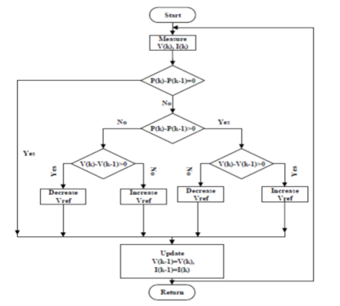 V_MPP tracking is required for maximum power extraction. MPPT algorithms can be used to improve the efficiency of a system employing MPP tracking [14]. MPPT methods include perturb and observe, incremental conductance, fractional circuits, and fuzzy networks [16]. The perturb and observe technique is used in this paper because of its ease of implementation and cost-effectiveness. By tracking the maximum power point, this technique generates a reference voltage.