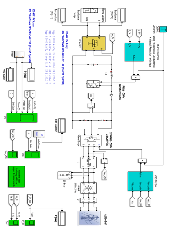 A 100 kW 1000 W/m2 PV generator is connected to a 25 kV grid using a boost DC/DC chopper and a three-phase three-level voltage inverter in this setup. In the boost converter, the MPPT controller is implemented. In this case, We chose the boost type converter since the PV generator can give a maximum voltage of 273.5 volts and a current of 368.28 ampere at the input of the DC-DC converter, and we required 500 volts at the input of the three-phase inverter. The PV generator is made up of 66 PV strings that are joined in series. Each PV string is made up of five PV modules that are linked in series. Each PV module is made up of 96 PV cells that are linked in series.