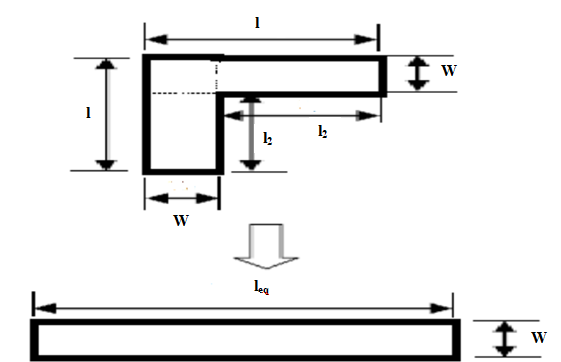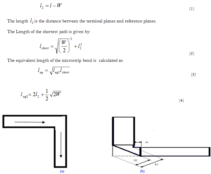 The electrical length of a right-angled microstrip bend may be determined by replacing the microstrip circuit containing the bend with a straight piece of microstrip transmission line having an equivalent length, see Figure 2.