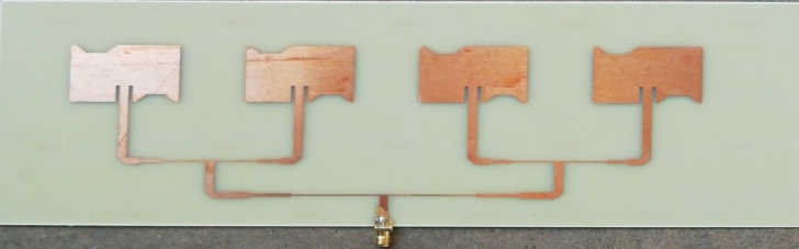 1x4 antenna array of dimensions 290mm x114.688mm x1.6mm with the 4 patch elements separated by 150mm was arranged linearly as shown in Figure 4. The substrate was FR4 with a dielectric constant of 4.4. The substrate and ground plane dimensions are given in Table 1. The rectangular patch was modified using a step cut with quarter wave transformer and mitered bend feed network as shown in the Figure 4 and Figure 5 respectively. Figure 6 illustrates 4 element array antennae with step cut with quarter wave transformer.  Figure 7 describes the prototypes of a 4 element array antenna with step cut with mitered bend feed.
