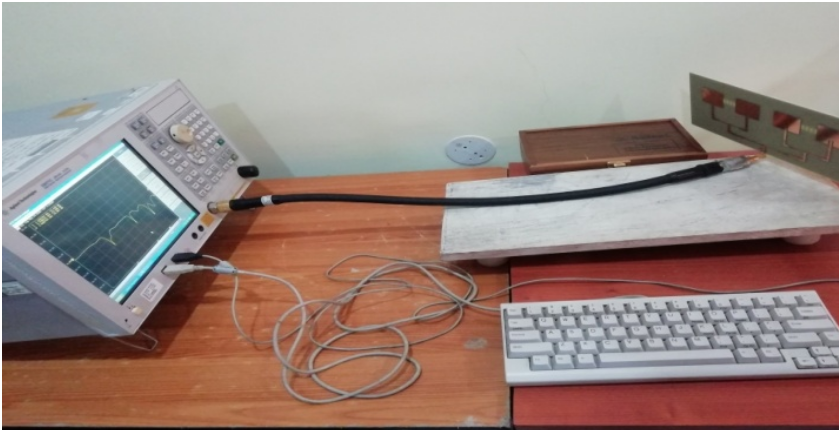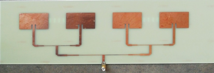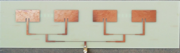 The experimental setup for measuring the antenna performance characteristics, such as the reflection coefficient and VSWR, of four elements of a patch antenna array using quarter wave and mitered bend feed network are shown for the two antenna models in Figure 12 and Figure 13