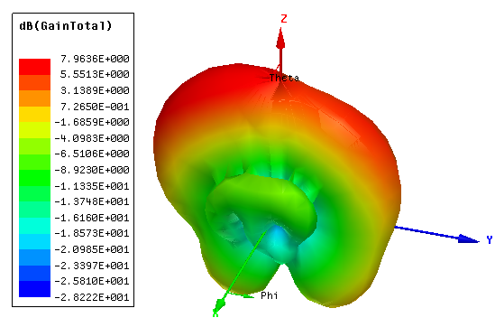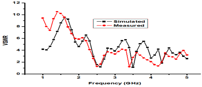 The simulated and measured return loss vs frequency plots for 4 element array antenna with step cut excited with quarter wave feed are shown in the Figure 14. The simulation results show two resonant frequencies reported at 2.6GHz and 4.3 GHz with minimum values of respective S11 dB reported as -22.762 dB and -16.468 dB, and the measured resonant frequencies are 2.54GHz and 4.22GHz with S11 values of -22.910dB and -24.132dB. The simulated and measured voltage standing wave ratio (VSWR) vs frequency plots are shown in Figure 15. The VSWR values were below 2 for these two resonating bands. The simulated and measured results of VSWR values were 1.156 at 2.6GHz, 1.353 at 4.3GHz and 1.163 at 2.54GHz and 1.194 at 4.22GHz respectively. The simulated 3D gain values were a maximum of 5.761dB and 5.806dB for quarter wave transformer feed with step cut 4 element array antennae shown in Figure 16. Figure 17 shows the simulated radiation pattern of a 4 element array antenna with step cut using quarter wave transformer feed. The same array, when excited with mitered bend, gives three resonating bands with resonating frequencies 2.6, 3.5 and 4.3 GHz with minimum values of return loss reported were -21.601, -25.096 and -10.587 dB respectively as the simulation results and the measured resonant frequencies were 2.54GHz, 3.43GHz and 4.26GHz with S11 values of -18.852dB,-18.301dB and -20.695 respectively. The simulated and measured VSWR vs frequency plots are shown in Figure 19. The VSWR values were below 2 for these two resonating bands. The simulated and measured results of VSWR values were 1.181 at 2.6GHz, 1.117 at 3.5GHz, 1.839 at 4.3GHz and 1.251 at 2.54GHz, 1.298 at 3.43GHz and 1.229 at 4.26GHz respectively. The simulated 3D gain values were a maximum of 8.670dB, 7.963dB and 6.215dB for mitered bend feed with step cut 4 element array antennae is shown in Figure 20. Figure 21 shows the simulated radiation pattern of a 4 element array antenna with step cut using mitered bend feed. The comparison of simulation results with its measured results are shown in Figure 14, 15, 18 and 19.