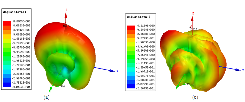 Figure 20. 3D polar plot of 4 element array antenna with step cut using mitered bend feed (a) 2.6GHz (b) 3.5GHz (c) 4.3GHz.