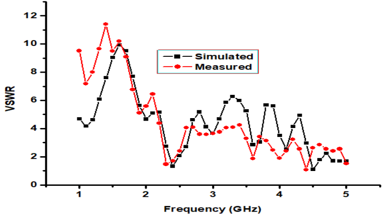 Figure 22 and Figure 23 represent the experimental set up of a 4-element array antenna with DGS and quarter wave transformer and a 4-element array antenna with DGS and mitered bend feed network. The comparison of simulated and measured return loss vs. frequency, VSWR vs. frequency plots of 4 element array antenna with DGS excited with quarter wave feed are shown in the Figure 24 and Figure 25 respectively. The simulation results showed two resonant frequencies were reported at 2.4 and 4.5 GHz with minimum values of respective S11 dB reported as -17.132 dB and -26.253 dB, and the measured results showed two resonant frequencies reported 2.32GHz and 4.40GHz with minimum values respective S11 dB reported as -14.92dB and -26.99dB. The VSWR values were also acceptable and below two for the resonating bands. The simulated and measured results of VSWR values were 1.323 at 2.4GHz, 1.101 at 4.5GHz and 1.507 at 2.32GHz and 1.068 at 4.40GHz respectively. The simulated 3D gain values were a maximum of 8.725dB and 7.342dB for quarter wave transformer feed with DGS 4 element array antenna as shown in Figure 26. Figure 27 shows the simulated radiation pattern of a 4 element array antenna with DGS using quarter wave transformer feed.  The same array, when excited with mitered bend feed, the comparison of simulated and measured return loss and VSWR plots are shown in Figure 28 and Figure 29 respectively. The simulation plot showed four resonating bands obtained at resonating frequencies 2.4, 3.6, 4.5 and 4.7 GHz. The minimum values of return loss reported were -14.057, -10.392, -17.395, -13.976 dB and the measured results showed four resonating bands obtained at resonating frequencies 2.48, 3.56, 4.46 and 4.74 GHz with the minimum values of return loss reported were -15.507, -12.711, -25.259 and -25.356dB. The simulated 3D gain values were a maximum of 8.725 dB, 8.887dB, 13.118dB and 13.006dB for mitered bend feed with DGS shown in Figure 30. The measured resonating bands of the proposed 4 element array antenna with DGS and mitered bend feed   were (2.26-2.46GHz), (3.46-3.62 GHz), (4.35-4.58 GHz) and (4.63-4.86 GHz) suitable for LTE, Wi-Fi, WLAN and military communications.