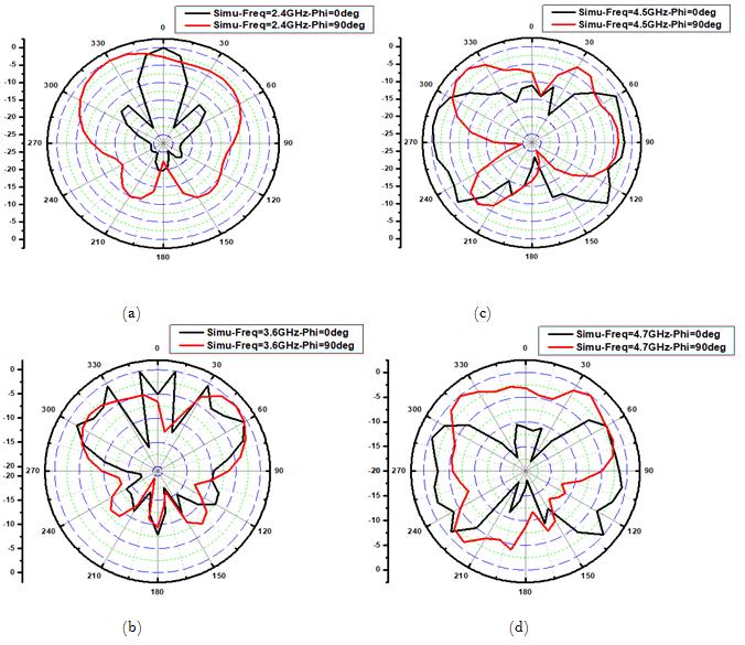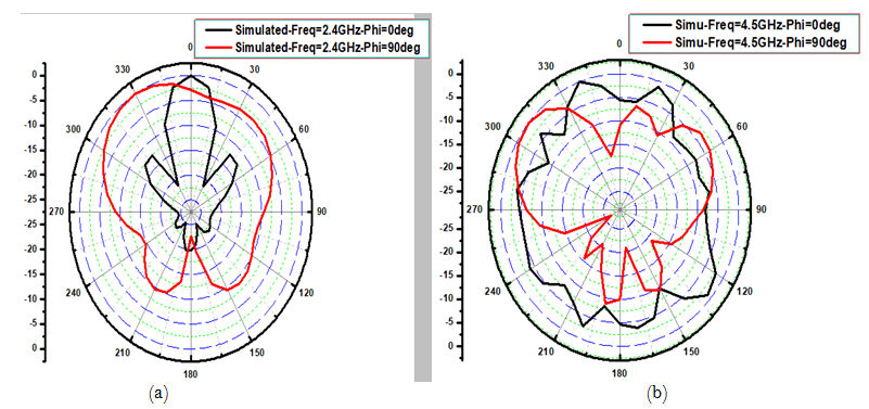 Figure 17. Simulated radiation pattern of 4 element array antenna with step cut using quarter wave transformer (a) 2.6GHz (b) 4.3GHz.