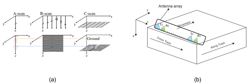 Figure 2. Definition of GPR data outputs: (a) GPR range profiles, (b) movement directions.