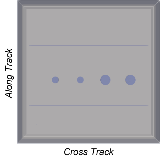 The dataset, which contains 20 simulation scenarios, is generated using the gprMax program. Eight of these simulation scenarios are shown in Figure 3 to prevent confusion. Each scenario is scanned as shown in Figure 2b. A transmitter and receiver antenna pair is moved across along-track dimensions between 10–70 cm, which creates a B-scan. Each time the pair is finished scanning the along-track dimensions, it is moved 5 cm in the cross-track dimension and scanned again. This process is repeated 14 times in a cross-track position simulating an antenna array with 14 transmitter and receiver pairs. Thus, one C-scan consists of 14 B-scans for each scenario. In each simulation, some wires have different orientations and clutter modeled as spheres at different depths.