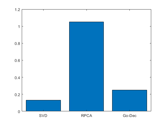 A time comparison is made with the same scenario used in the SNR comparison. The RPCA method is much slower than the singular value decomposition (SVD) and GoDec methods. The SVD is the fastest algorithm to work with for this study. However, the time difference between the SVD and GoDec could be ignored since the SNR of GoDec is better than the SNR of SVD. The comparison results are shown in Figure 8.