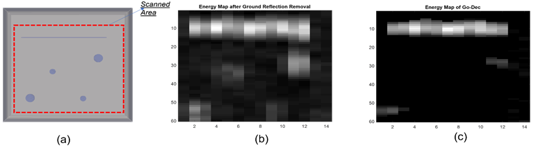 Figure 3. (a) Scenario with wire and clutter; (b) Energy map of ground reflection removal; (c) GoDec energy map.