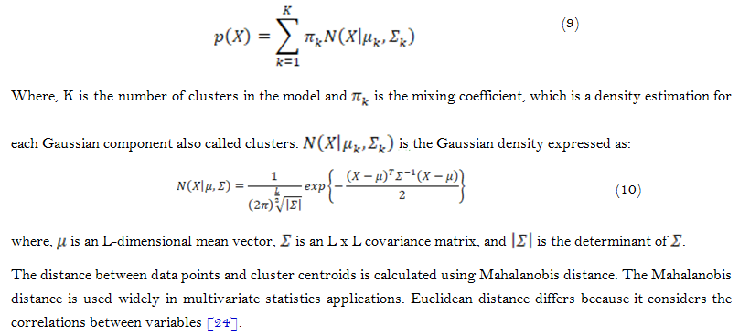 The GMM is used when the data distribution is unknown [23]. The GMM is an unsupervised clustering technique which is based on probability density estimations. It creates ellipsoidal-shaped clusters using expectation–maximization. The clusters are of a Gaussian distribution, always described by the mean and standard deviations. Using the mean and the covariance instead of only using the mean, as in the k-means, gives the GMM the ability to provide a better quantitative measure of fitness per number of clusters [22].