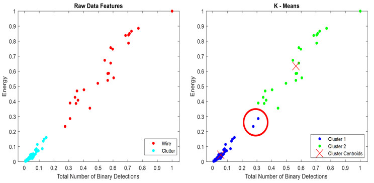 The clustering method is studied for detecting an object and deciding whether it is a wire. For the clustering, there should be some features to utilize. Yılmaz [2] explains in detail which features might be used for wires. We use energy and the total number of binary detections. Based on these features, raw data of the simulation scenarios are shown in Figure 11. Feature datasets are normalized to avoid confusion.
