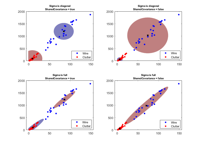 Confidence ellipsoids are drawn with 95% confidence. The GMM could not detect four wires and mis-detected three clutter points. If we increase the confidence level, then an increase would be seen in the volume of confidence ellipsoids, and the volume will decrease if the confidence level decreases. The clustering performance results of the GMM based on the confidence thresholds are compared for accuracy value, which is the ratio of the total number of accurate clustering to the total number of detections. The evaluation results are shown in Table 2.