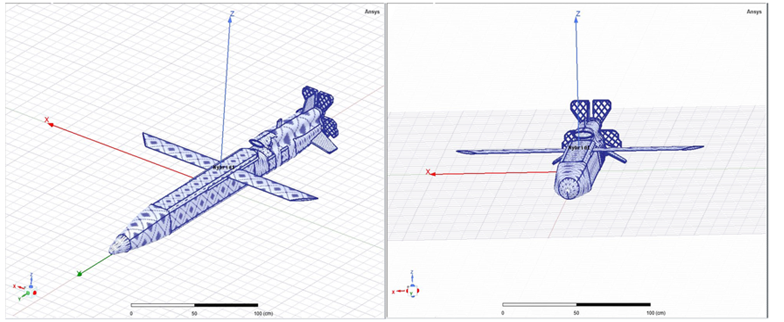 In this study, the step model of the MALD platform was created and transferred to the ANSYS HFSS program before the antenna and RCS analyzes were performed. The fuselage materials, wings, and tail sections were chosen as aluminum. The view of the MALD platform from the side and nose of the ANSYS HFSS program is shown in Figure 2.