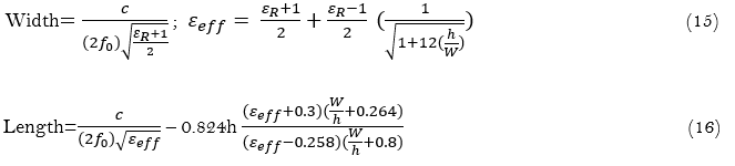 The main advantage of this type of feeder is that the feed can be placed anywhere in the patch to match the input impedance. This supply method is easy to manufacture and has low interference emissions. However, their main drawbacks are their low bandwidth and the need to drill holes in the board, making them difficult to model. Since the connector protrudes above the ground plane, it will not be perfectly planar for thick boards. Also, longer probe lengths for thicker boards make the input impedance more inductive, creating matching problems. In this study, coaxial-type feeding is not used because it is difficult to model and unsuitable for the MALD platform since it is necessary to drill holes in the substrate. In the proposed model, microstrip antennas were found suitable for analysis in terms of feasibility, cost, and effective results. Microstrip antenna calculation formula,