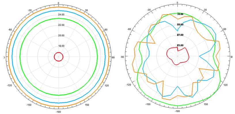 Secondly, seven microstrip antennas used on the MALD platform to imitate B-52 Stratofortress. Seven microstrip antennas, which had good results before, were wrapped conformally to the missile's fuselage in Figure 13. A separate port was created for each antenna, and the distance between them was equal. Analysis performed for 1,2,3 and 4 GHz. As seen in Figure 12, if antennas are not active, the result of the missile RCS is on the left side, and if antennas are active, the result of the missile radar cross section in the right side.