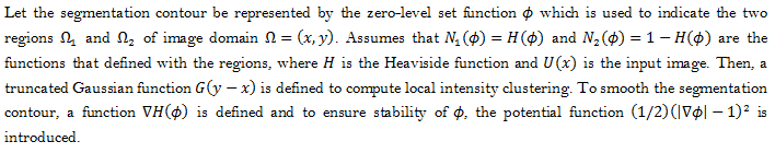 Based on Equation 1, researchers[12] made the Level Set Based Bias Field Correction (LSBF) model, which is a local intensity clustering ACM, to deal with the uneven intensity. This model determines and specifies the local clustering intensity, which is subsequently integrated with regard to the neighbourhood centre. As a global form of ACM, the LSBF model may not be able to selectively segment a specific item in an image, even though it is excellent at segmenting pictures with intensity inhomogeneity.