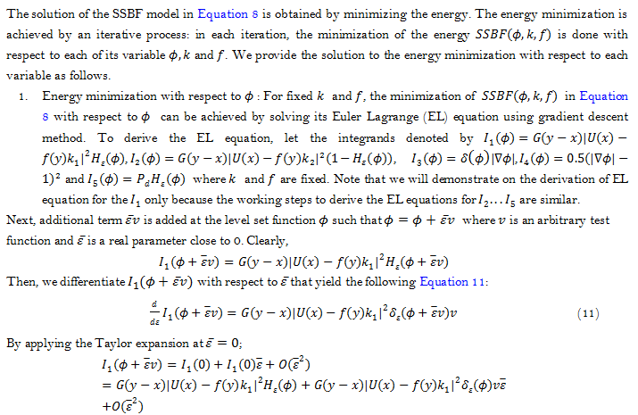 Where  is a constant and represented as vector k  and is the bias field. The Equation 2 is minimized iteratively using a gradient descent approach.  The LSBF was invented for segmenting whole objects, which is inapplicable in the case of selective segmentation.