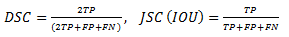 The performance of all models was evaluated by the Dice similarity metric (DSC) and Jaccard similarity metric (JSC), also known as the Intersection over Union (IOU) coefficient, in the range of  as follows:
