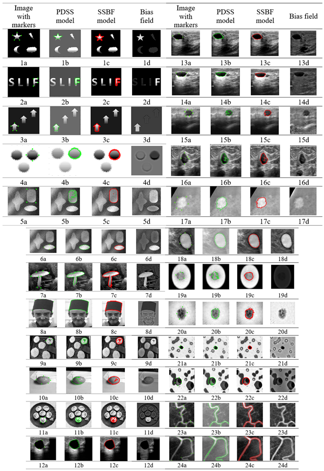 Figure 3 demonstrates the test image with markers used in the first and fifth columns (1a-24a). The second and sixth columns (1b-24b) showed the results delivered by the PDSS model, while the third and seventh columns (1c-24c) demonstrated the results delivered by the SSBF model. The bias-corrected results produced by our SSBF model are shown in the last column (1d-24d). Bias correction images were used in this study to gain an accurate result. As shown in the figure above, our SSBF model was able to segment all the targeted objects highlighted with green markers compared to the PDSS model.