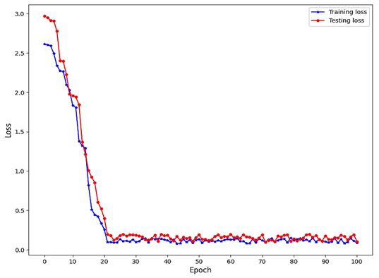 Conversely, the testing loss of 0.10 represents the mean variance among the true labels on the hidden testing results and the predictions made by the model. It is slightly higher than the training loss, which is expected as the model is evaluated on data that it has not been directly trained on. However, a testing loss of 0.10 is still relatively low, indicating that the model is generalizing well and performing reasonably accurately on new, unseen data. It's worth noting that the loss values should be interpreted in the context of the specific problem and dataset. Even though these loss figures indicate that the model is operating effectively, in order to fully comprehend how it performs, one must also take into account additional assessment metrics.