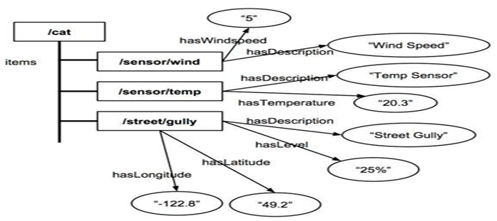 We referred the HyperCat specification as in Hyper [17] developed by the 8 consortia. HyperCat specifies a catalogue and quires on the rules available on the web. Exposed resources are described to provide information about the format and semantics statements as shown in Fig. 5. This enables applications to search for suitable resources and understand the data when they retrieve it. Due to this it is easily describe the resources and easy query on the applications interested by the users. Blackstock and Lea [23].
