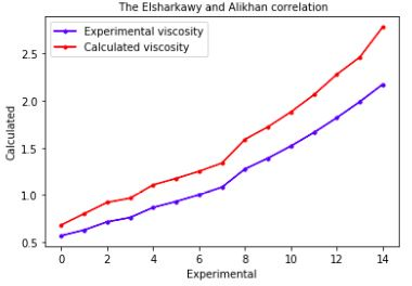 Figure-1. The comparison of experimental viscosity with calculated viscosity by Elsharkawy and Alikhan correlation.