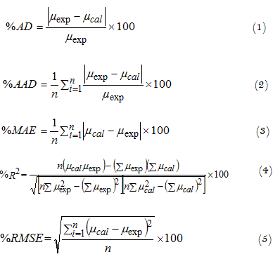 Where, n is the number of experimental points, is experimental viscosity, is calculated viscosity. AAD% shows how to be near the calculated values are to experimental values.