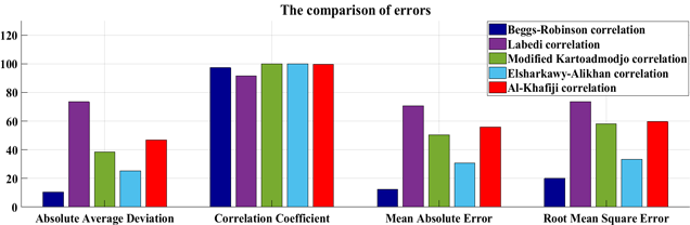 As seen from Figure 6, the %AAD value is respectively 10.5614, 73.4591, 38.3125, 25.2323, and 46.9403%, and % is 97.2405, 91.4944, 99.8744, 99.9272 and 99.6687 for Beggs-Robinson, Labedi, modified Kartoatmodjo, Elsharkawy-Alikhan and Al-Khafaji corrections.