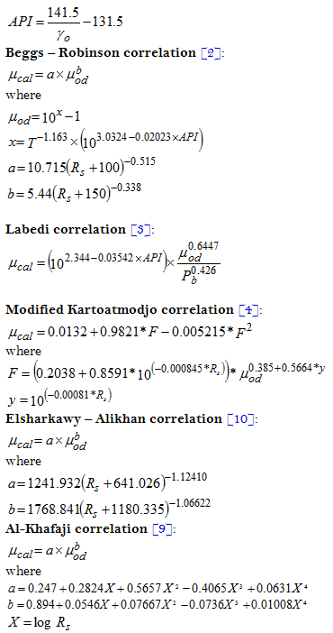 Beggs-Robinson, Labedi, modified Kartoatmodjo, Al-Khafiji and Elsharkawy-Alikhan correlations have been used which are come across mainly in the literature, for calculating oil viscosity [2-4, 9, 10].