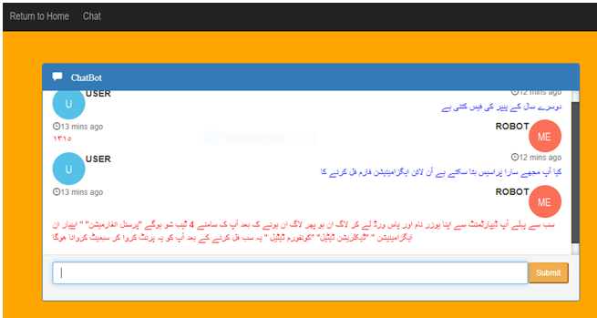 The main page or home page of typing based chatbot provides navigation choices for chatbots in two different languages. First option allows the user to start communication with bot using English language. Figure 3 shows user interface of English typing-based Chabot. In second option, the user can communicate with bot using Urdu language. Figure 4 shows user interface of typing based Urdu chatbot. The chatbot user interface is a text box where user can write their quires. After receiving the queries, the chatbot sends this input to the system and after receiving the response, it is displayed on the screens.