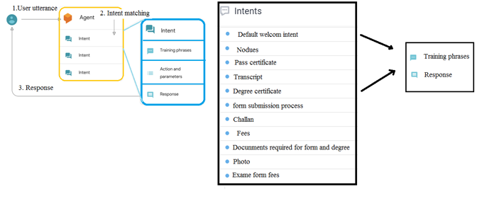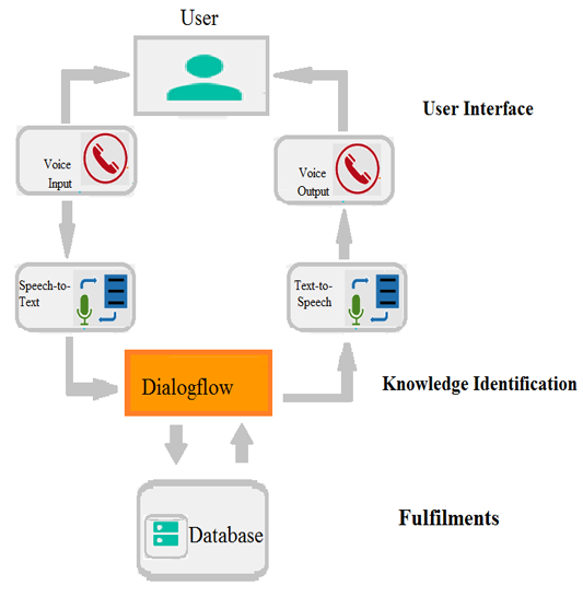 Voice based chatbot takes the voice input from user using the microphone. The Web speech APIs captures user voice from the microphone and conveys the input message to dialogflow for response. The web speech APIs is used for speech recognition and speech synthesis interface, it converts the user’s voice messages to text and text messages to voice. Dialogflow first examines the input message, received input message is matched and categorized to corresponding intent. An intent map what a user says and how he wishes the system to respond. When an intent is got by dialogflow, then required information is send to fulfillments. Further fulfillments produce dynamic responses which are based on information looked up from a database. The database of voice based chatbot is shown in Figure 6. Once it is retrieved, the necessary information is passed back through dialogflow. The dialogflow returns the response text back to the user by using the speech synthesis interface to give it a synthetic voice.